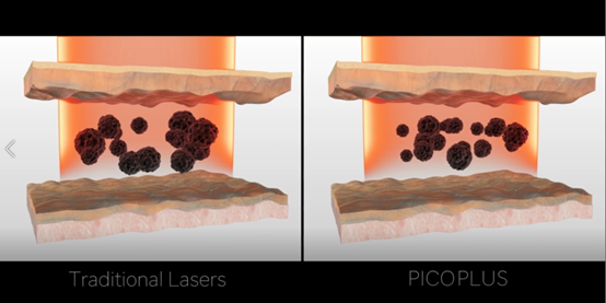 PICOPLUS皮秒雷射是一種較新型的皮膚治療技術,雷射擊發速度比傳統奈秒雷射擊發速度快千倍,運用「光震波原理」能夠將色素粒子震碎成更細小的粉塵狀,讓身體更容易代謝;同時更短的脈衝時間,能夠降低雷射在肌膚停留的時間,減低傳統雷射容易造成過多熱傷害及組織破壞的機率,是更新、更安全的肌膚治療利器。